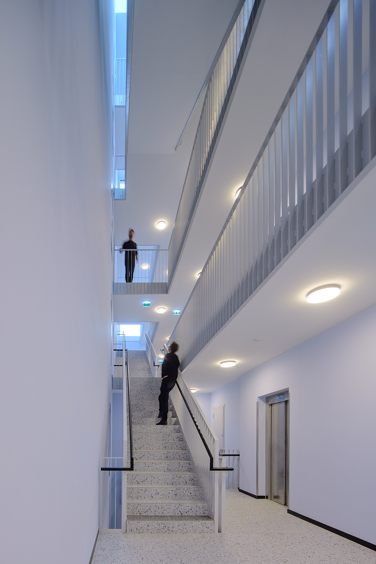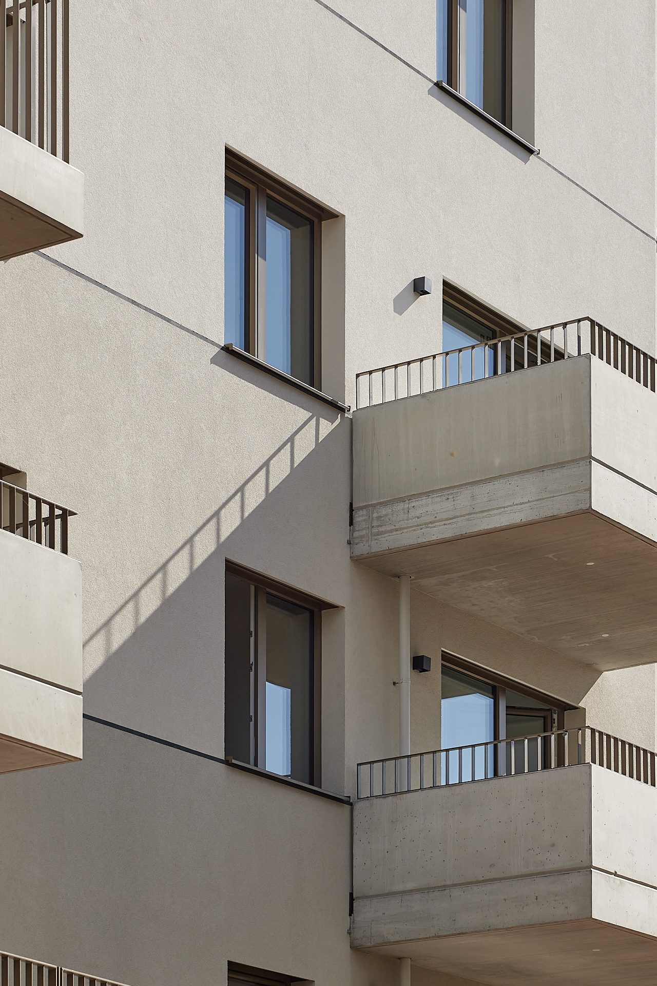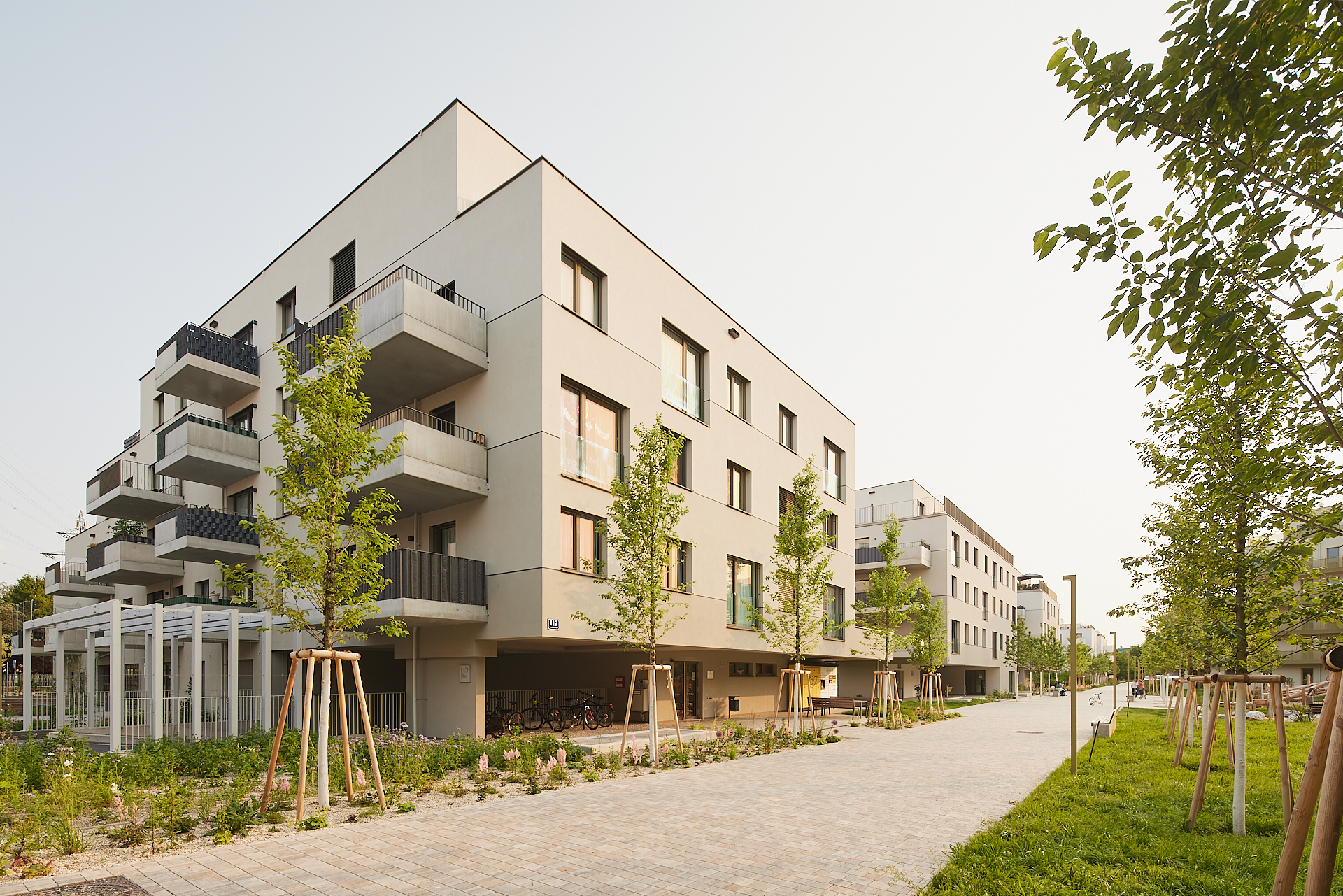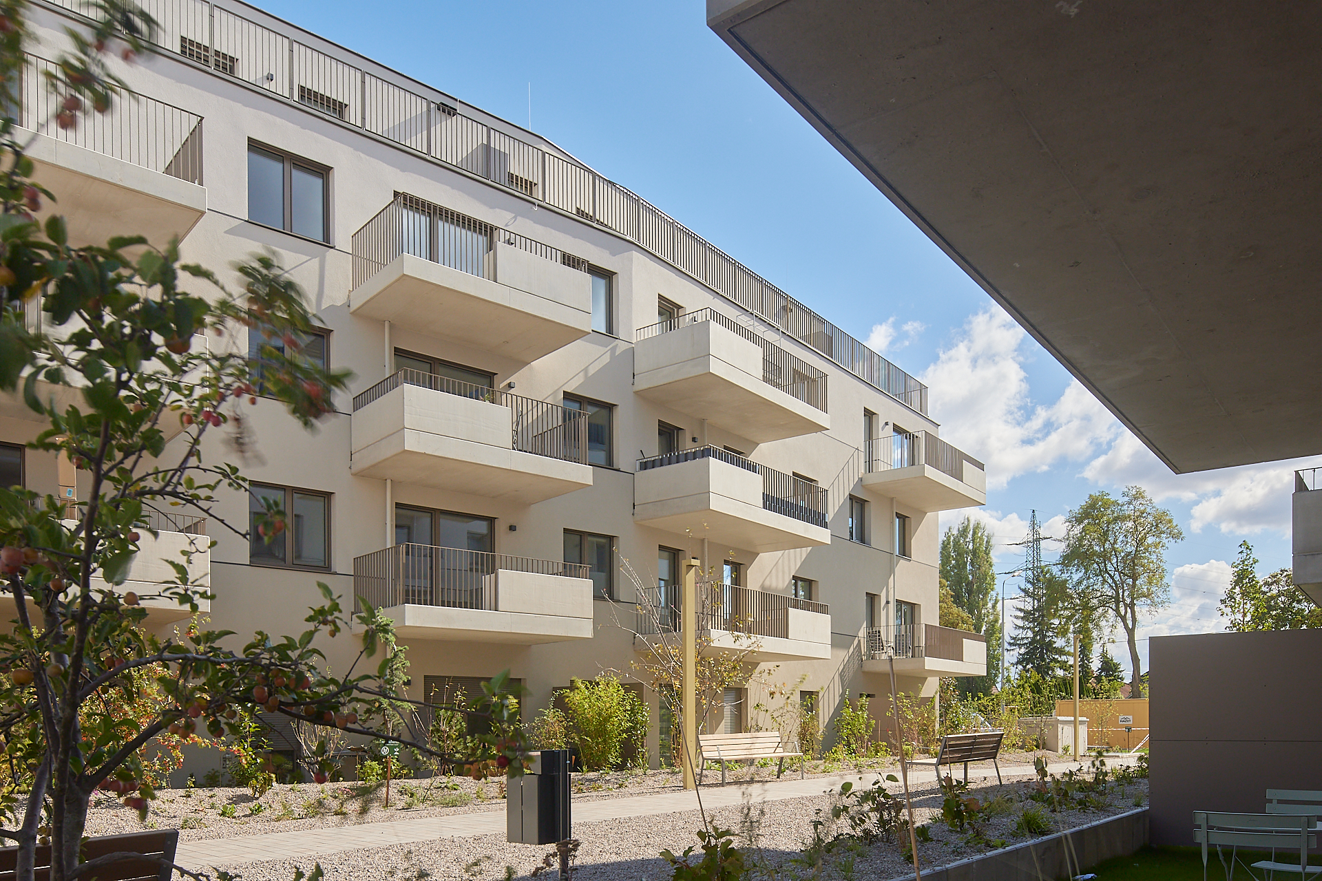 Das Projekt im Gebiet Hirschfeld ist Teil eines übergeordneten Masterplans, der das Areal in drei Baufelder gliedert und dabei auf die unterschiedlichen Anforderungen der Lage reagiert. Entlang der belebten Gerasdorfer Straße werden zwei terrassierte Wohnhäuser realisiert, die sich nach Süden hin abstaffeln und so auf die gegenüberliegende Bebauung eingehen. Ergänzt wird das Ensemble durch ein kompaktes Punkthaus mit begrüntem Atrium, das eine offene und kommunikative Erschließung ermöglicht. Eine zentrale, autofreie Esplanade dient als Rückgrat des Quartiers und verbindet die Baukörper miteinander. Großzügige Terrassen bieten den Wohnungen private Außenräume, während gemeinschaftliche Flächen im Erdgeschoss eine aktive und belebte Zone schaffen. Dort finden sich unter anderem ein Gemeinschaftsraum, eine Fahrradwerkstatt und ein Kindergarten, der nicht nur den Bewohner:innen, sondern auch dem Umfeld zugutekommt. Das Atrium im Punkthaus fungiert als halböffentlicher Treffpunkt, in dem Begrünung und offene Laubengänge ein angenehmes Mikroklima erzeugen. Aufgeweitete Bereiche werden zu Orten der Begegnung, während durchgesteckte Wohnungen mit Querlüftung hohe Wohnqualität sichern. Auch die terrassierten Häuser bieten helle Stiegenhäuser mit Blickbezügen und Aufenthaltsqualitäten. So verbindet das Projekt architektonische Klarheit mit sozialem Mehrwert und einer starken Verankerung im Freiraum.