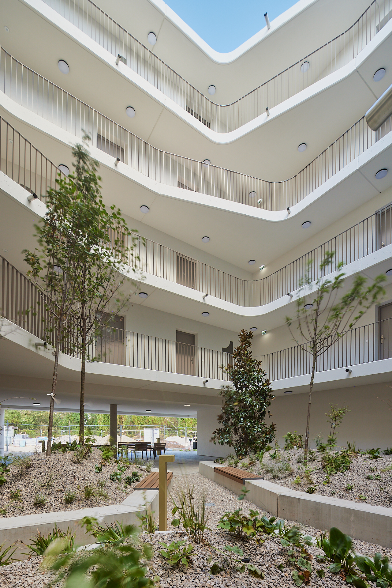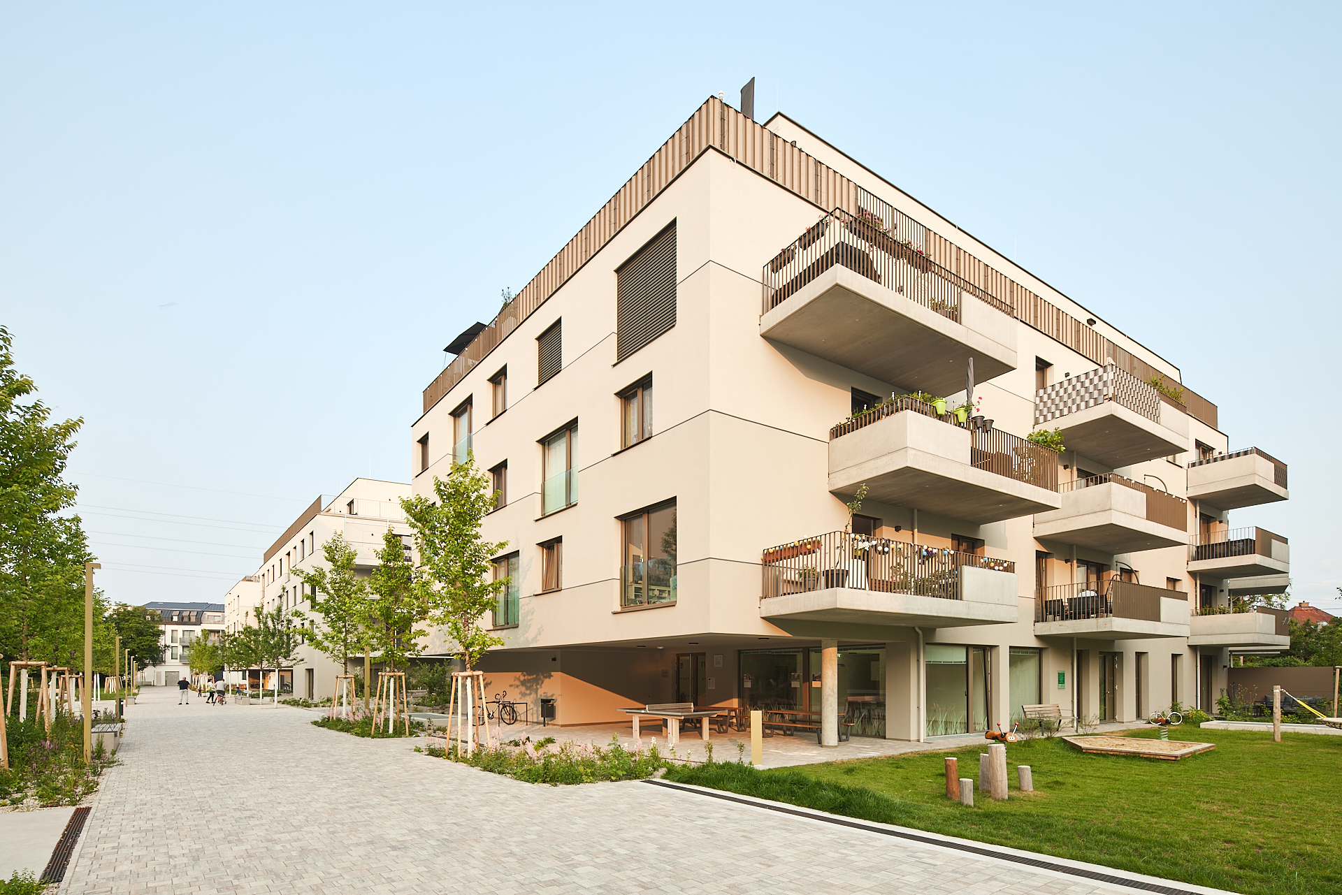 Die städtebauliche Idee basiert auf der klaren Zonierung des Areals: lautere Nutzungen entlang der Gerasdorfer Straße, ruhigere Wohnlagen zum angrenzenden Wald. Die autofreie Esplanade bildet dabei den zentralen Erschließungsraum und schafft ein verbindendes Rückgrat. Gemeinschaft und Nachbarschaft stehen im Fokus. Das begrünte Atrium im Punkthaus lädt zum Verweilen ein, während der gemeinschaftliche Hof mit Bepflanzung Identität stiftet. Terrassen, Balkone und Loggien bieten privaten Rückzug, ergänzend zu den kollektiven Freiräumen. Im Erdgeschoss verschränken sich Architektur und Außenraum: Räume für Begegnung, eine Fahrradwerkstatt sowie ein Kindergarten beleben die Zone und schaffen Mehrwert weit über das Projekt hinaus. So entsteht ein vielfältiges Wohnumfeld, das Nachbarschaft, Naturbezug und hohe Wohnqualität vereint.