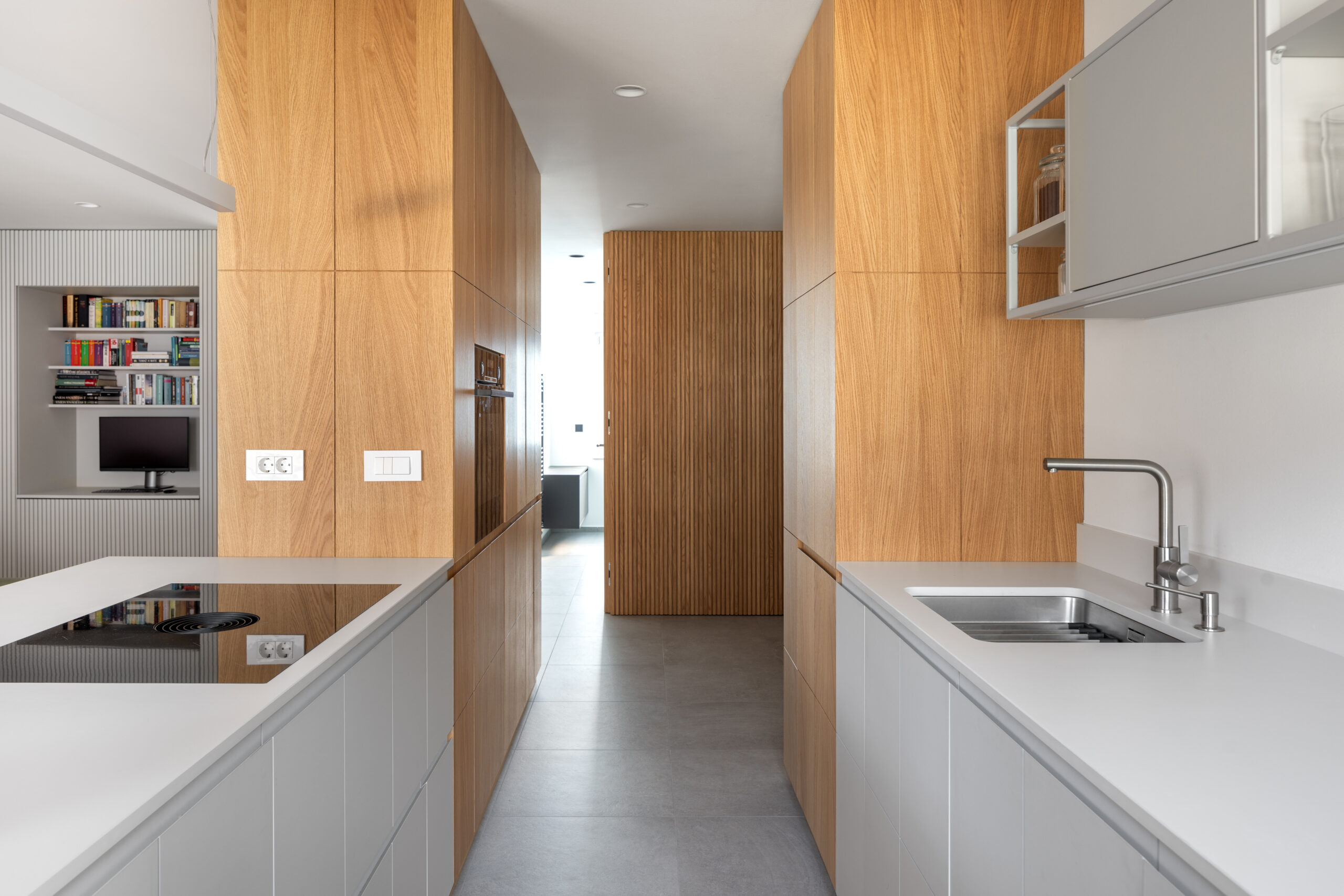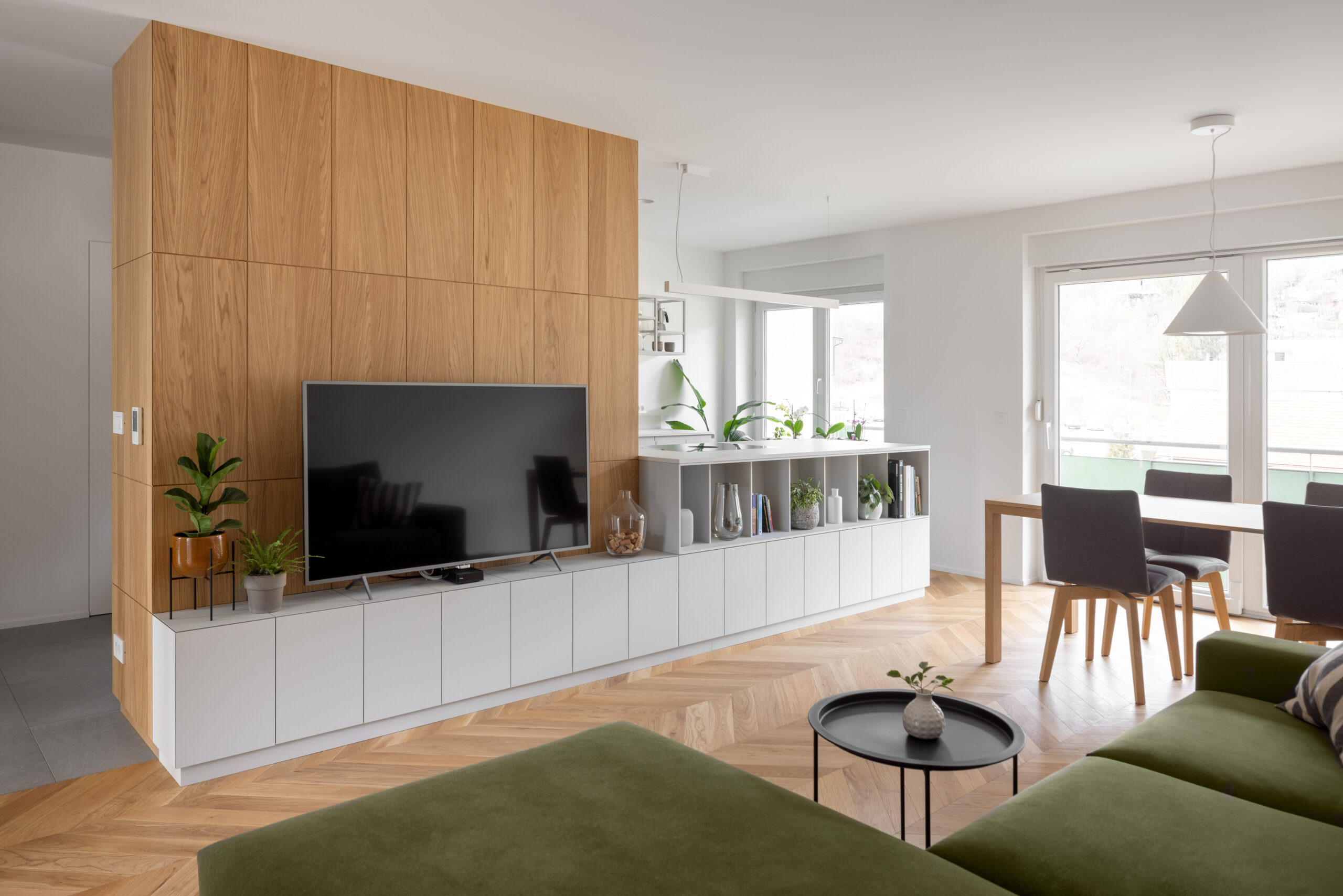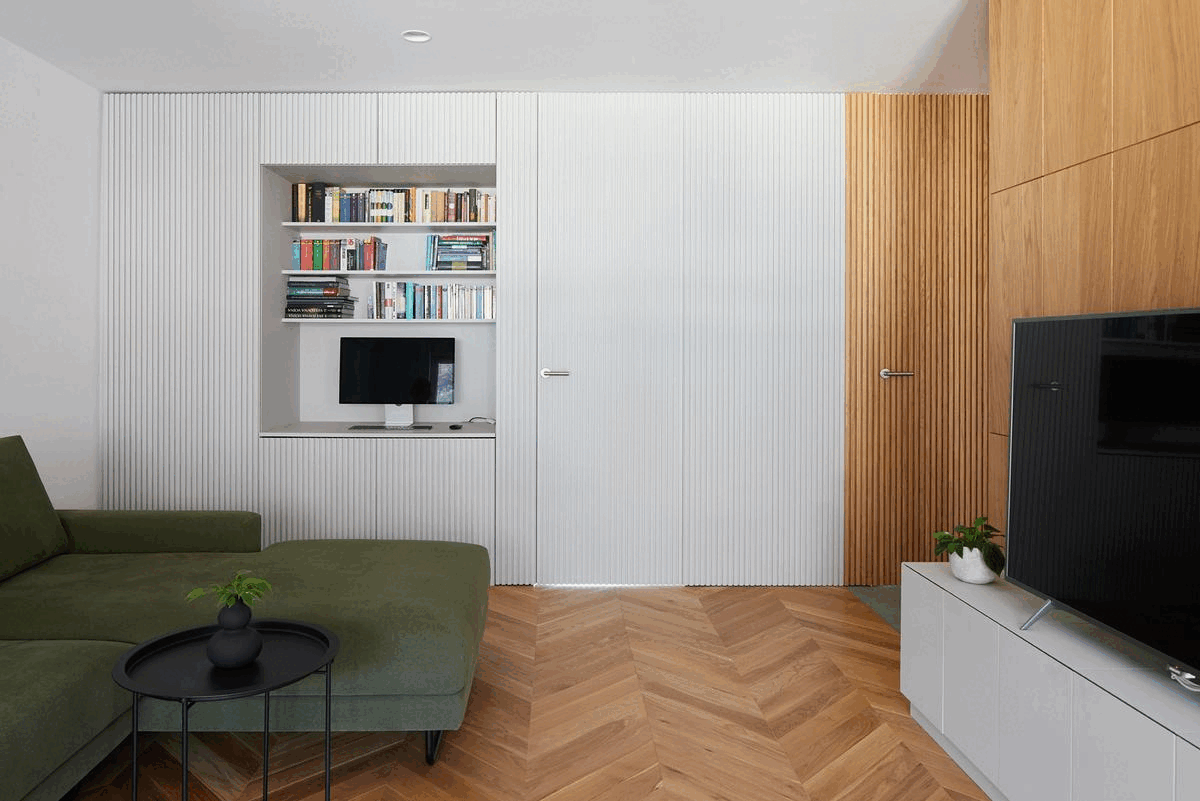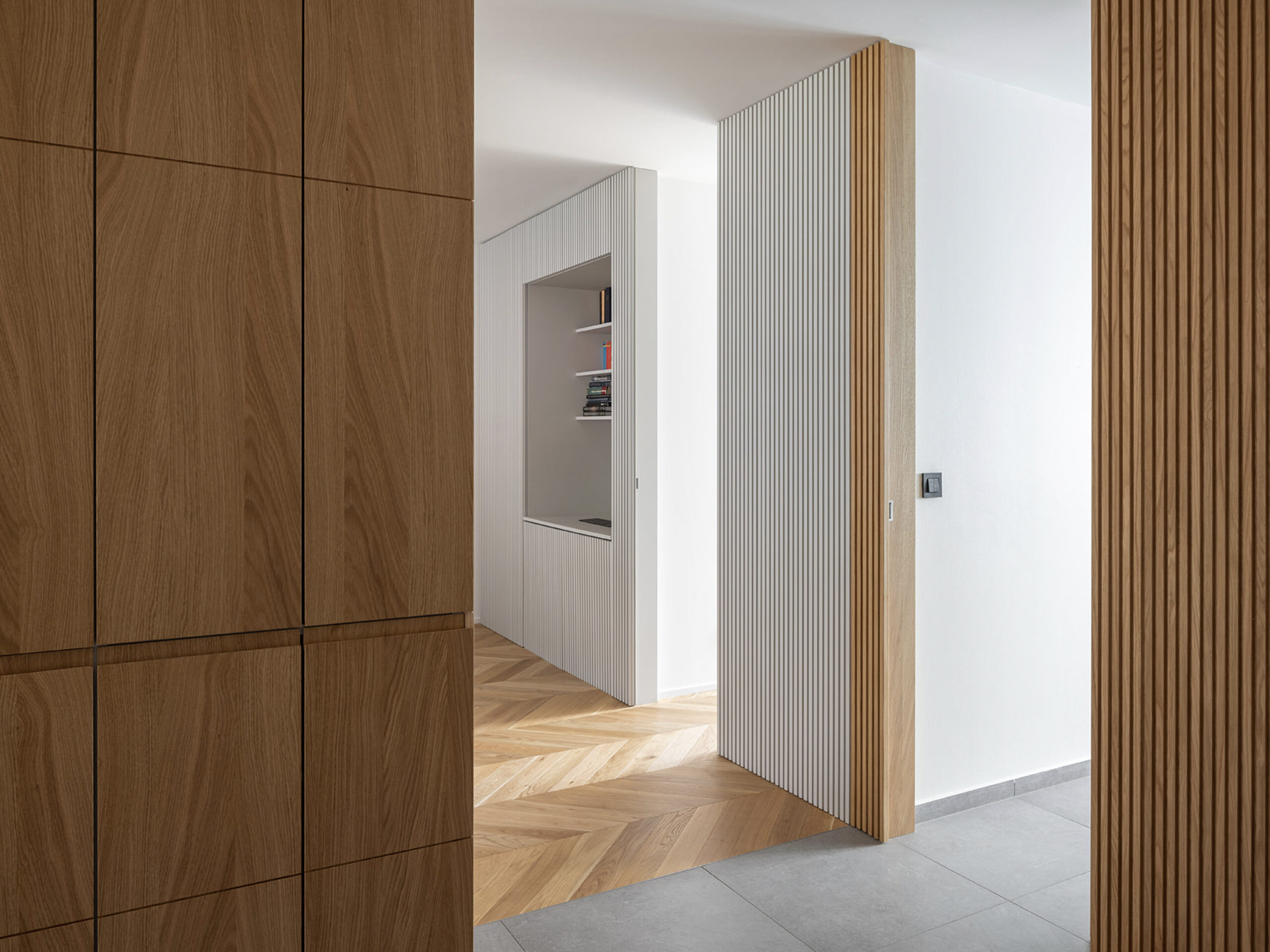 Die Wohnung wurde für ein junges Paar modern und funktional renoviert. Um ein großzügiges, helles und offenes Raumgefühl im Hauptwohnbereich zu schaffen, wurden sämtliche nicht tragenden Wände entfernt. Der Eingangsbereich ist nicht durch physische Barrieren vom Wohnraum getrennt, sondern wird allein durch gezielte Kombinationen von Materialien und Texturen optisch differenziert und subtil hervorgehoben. Ein zentrales Gestaltungselement ist die wiederkehrende Kombination von Eichenholz und grauen Oberflächen, die in zwei Variationen in der gesamten Wohnung eingesetzt wird: Im Eingangsbereich treffen keramische Bodenfliesen in grauer Textur auf Wandverkleidungen und Möbel aus Eichenholz, während im Wohnraum warme Eichenholzböden durch graue Möbelstücke und Wandverkleidungen ergänzt werden. Die Übergänge zwischen Eingang und Wohnbereich erscheinen fließend, da Möbelelemente in beide Zonen übergehen, gleichzeitig erzeugen die unterschiedlichen Materialien eine feine visuelle Abgrenzung. Während die offenen Bereiche der Wohnung einladend und repräsentativ gestaltet sind, bleiben die privaten Räume – Bad und Schlafzimmer – dezent verborgen. Sie befinden sich hinter einer strukturierten Wandverkleidung mit nahtlos integrierten Türen und Schränken, wodurch ein minimalistisches, aufgeräumtes und dennoch elegantes Gesamtbild entsteht.