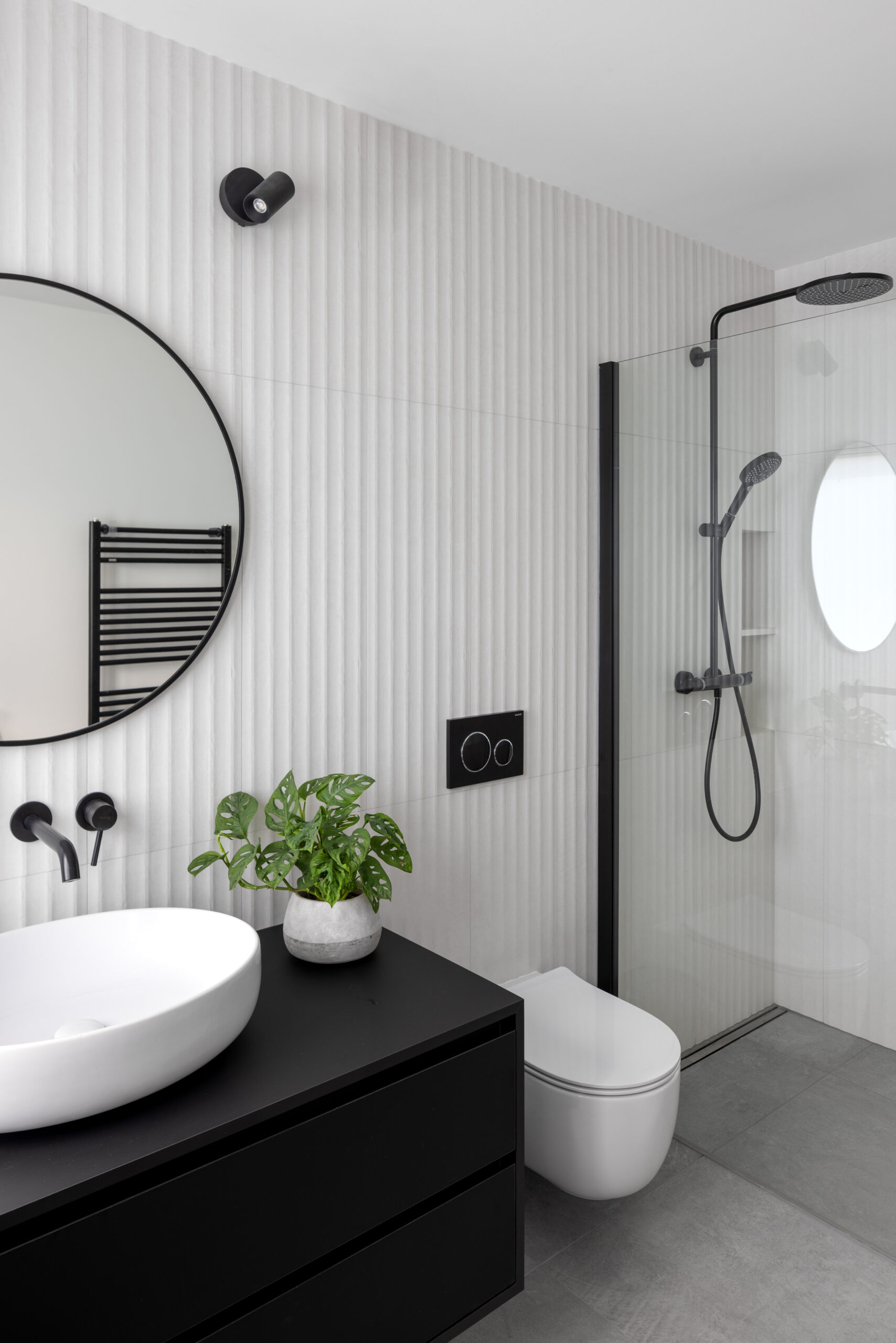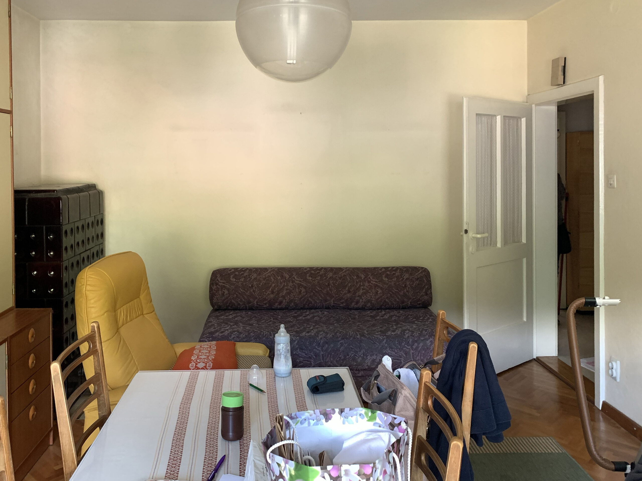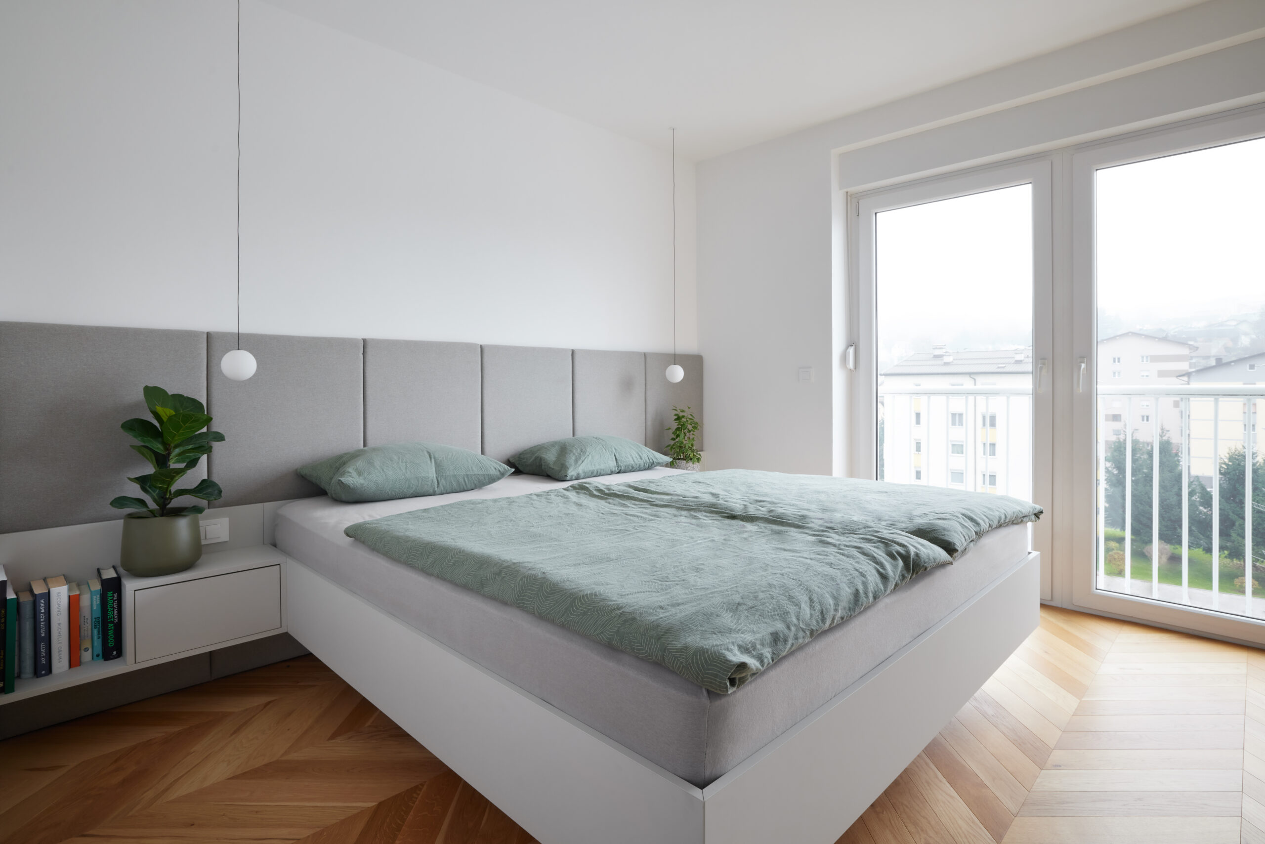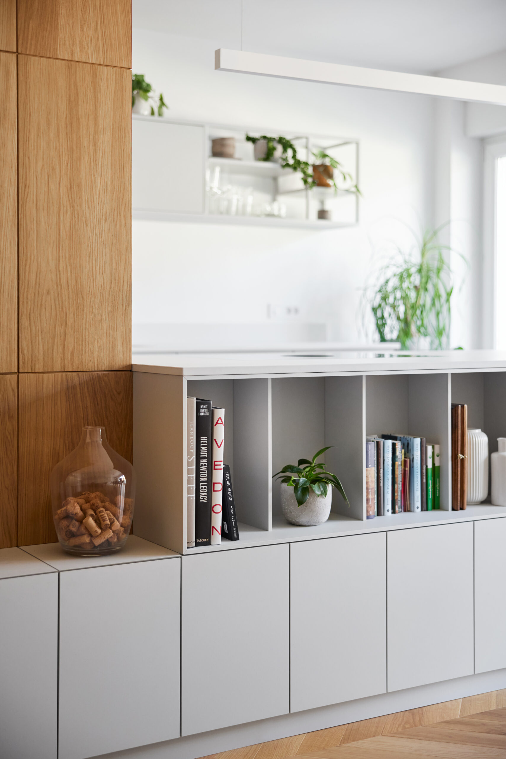 Die Wohnung wurde für ein junges Paar modern und funktional renoviert. Um ein großzügiges, helles und offenes Raumgefühl im Hauptwohnbereich zu schaffen, wurden sämtliche nicht tragenden Wände entfernt. Der Eingangsbereich ist nicht durch physische Barrieren vom Wohnraum getrennt, sondern wird allein durch gezielte Kombinationen von Materialien und Texturen optisch differenziert und subtil hervorgehoben. Ein zentrales Gestaltungselement ist die wiederkehrende Kombination von Eichenholz und grauen Oberflächen, die in zwei Variationen in der gesamten Wohnung eingesetzt wird: Im Eingangsbereich treffen keramische Bodenfliesen in grauer Textur auf Wandverkleidungen und Möbel aus Eichenholz, während im Wohnraum warme Eichenholzböden durch graue Möbelstücke und Wandverkleidungen ergänzt werden. Die Übergänge zwischen Eingang und Wohnbereich erscheinen fließend, da Möbelelemente in beide Zonen übergehen, gleichzeitig erzeugen die unterschiedlichen Materialien eine feine visuelle Abgrenzung. Während die offenen Bereiche der Wohnung einladend und repräsentativ gestaltet sind, bleiben die privaten Räume – Bad und Schlafzimmer – dezent verborgen. Sie befinden sich hinter einer strukturierten Wandverkleidung mit nahtlos integrierten Türen und Schränken, wodurch ein minimalistisches, aufgeräumtes und dennoch elegantes Gesamtbild entsteht.