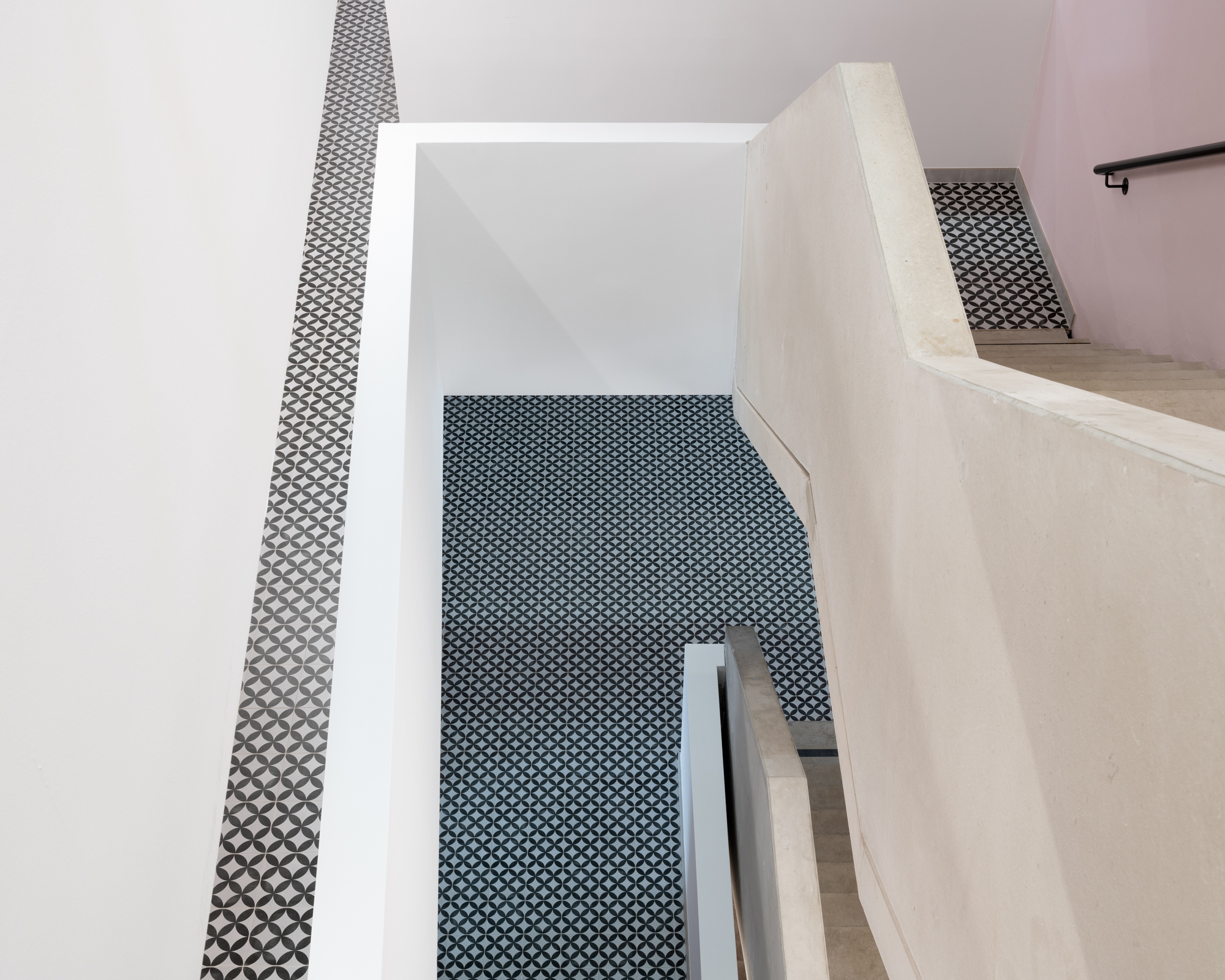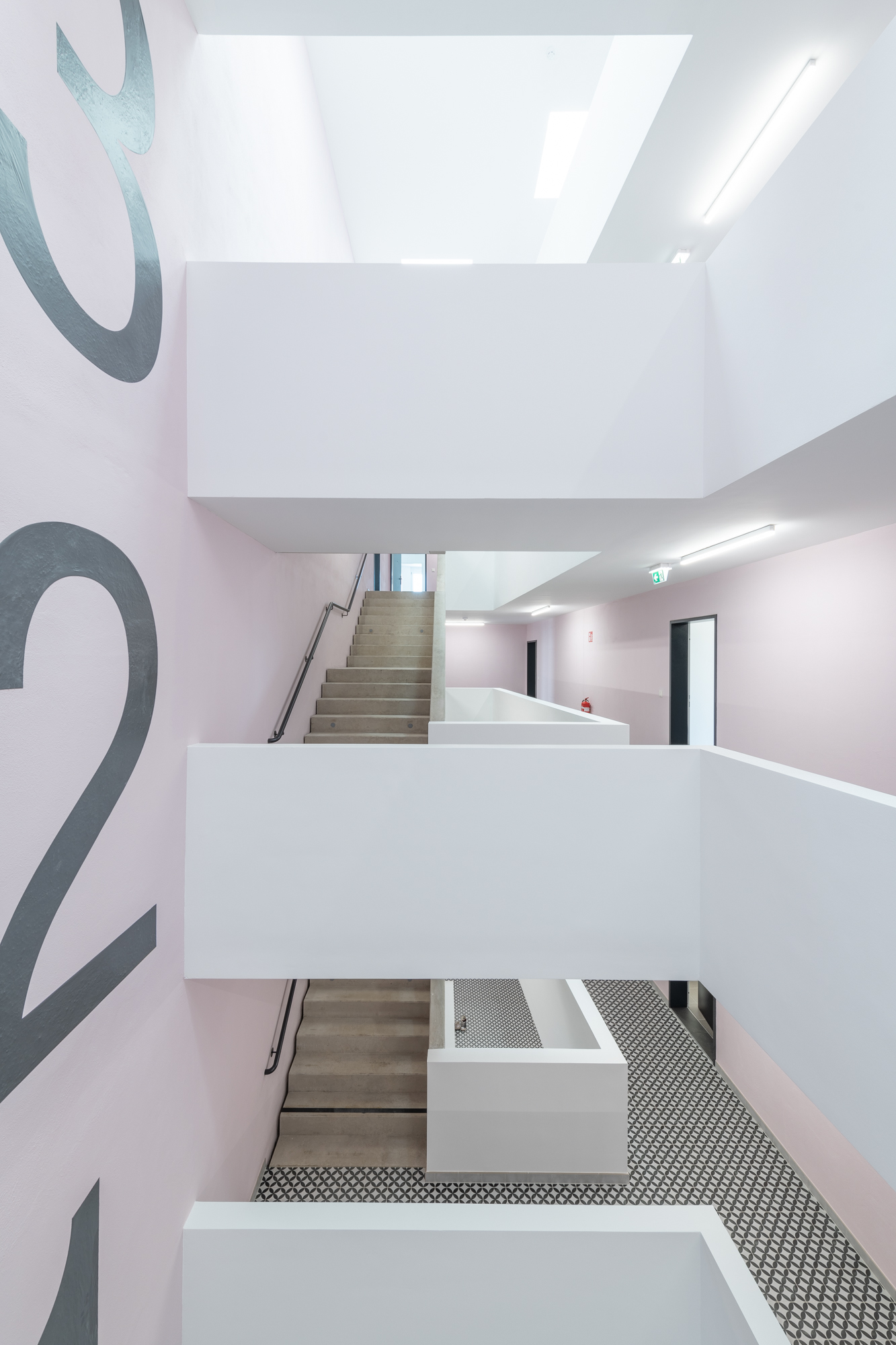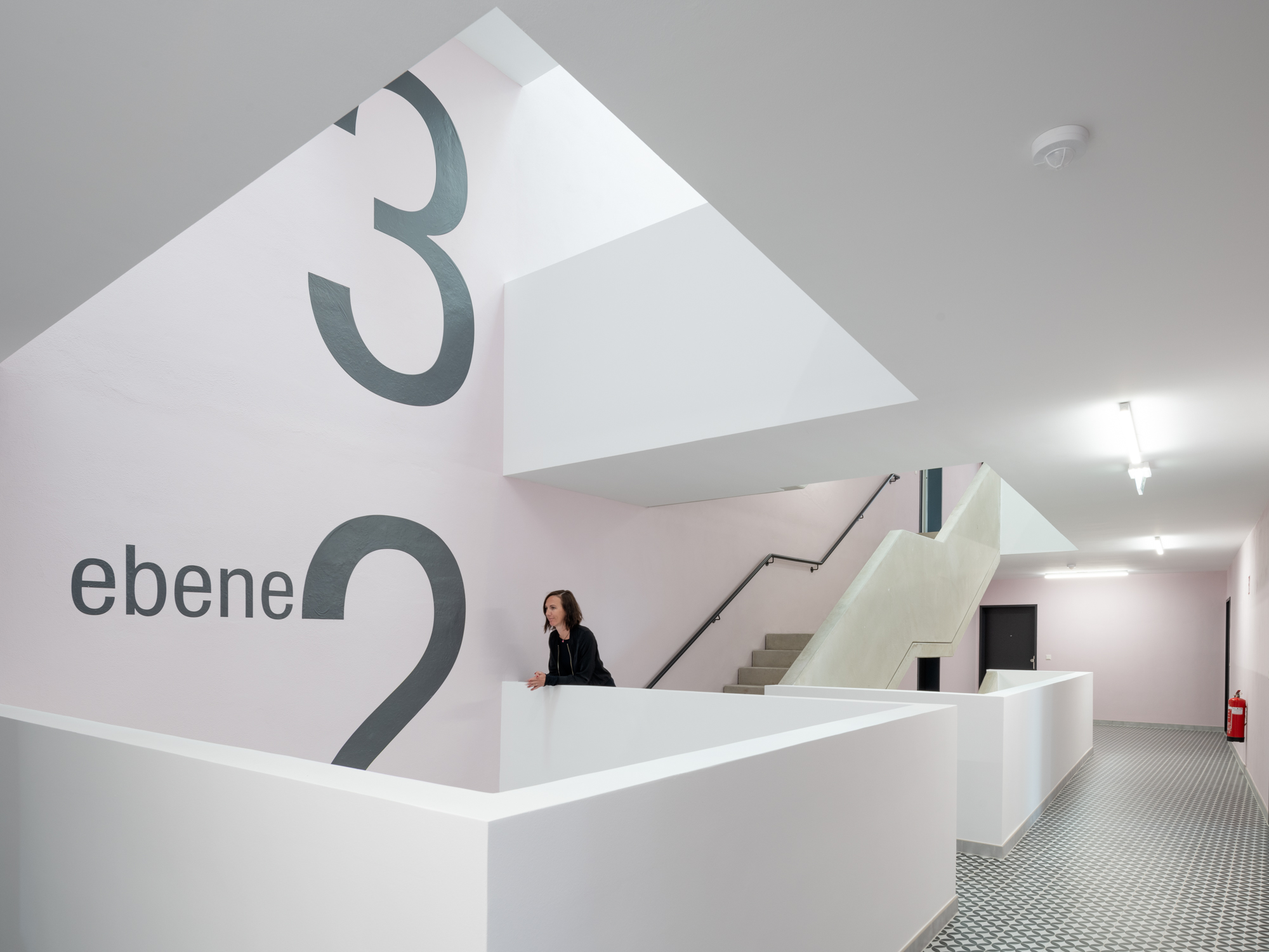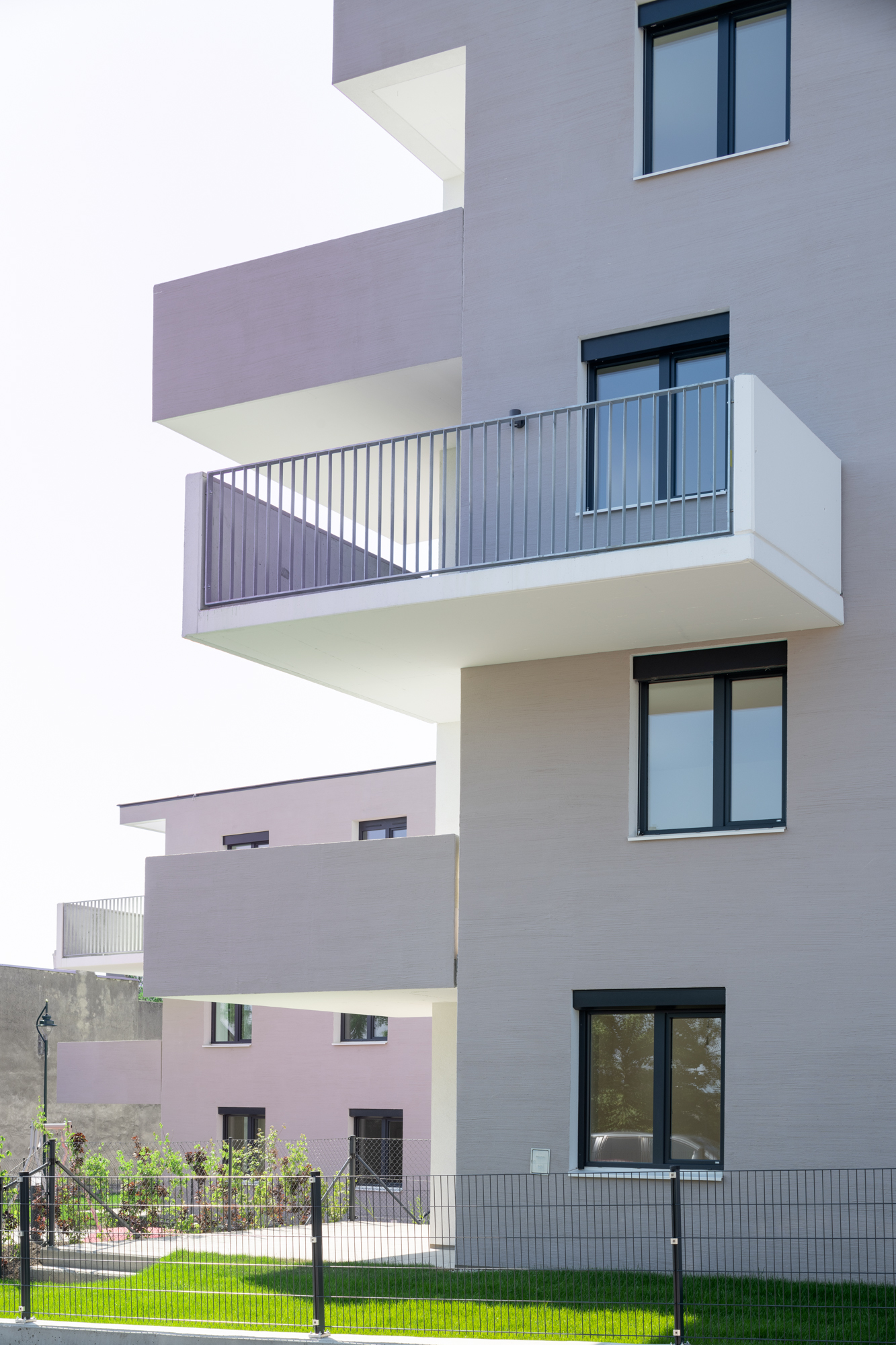 Vsa stanovanja imajo zasebne zunanje prostore – lože, balkone ali vrtove. Njihova etažno zamaknjena razporeditev ustvarja raznolike prostorske situacije: zaščitene niše omogočajo intimnost, odprti dvoetažni izrezi širijo poglede in povečajo prostorsko kakovost. Svetla stopnišča in kratke, razumljive poti poenostavijo vsakdanjo rabo in skrbijo za dobro orientacijo. Skupaj s hišnim vrtom – z igriščem, visokimi gredami in območjem za sprostitev – nastaja živahno, pretežno ozelenjeno bivalno okolje, ki se smiselno navezuje na sosednji park in pešpoti ter vzpostavlja jasne vizualne povezave med objektom in okolico.
