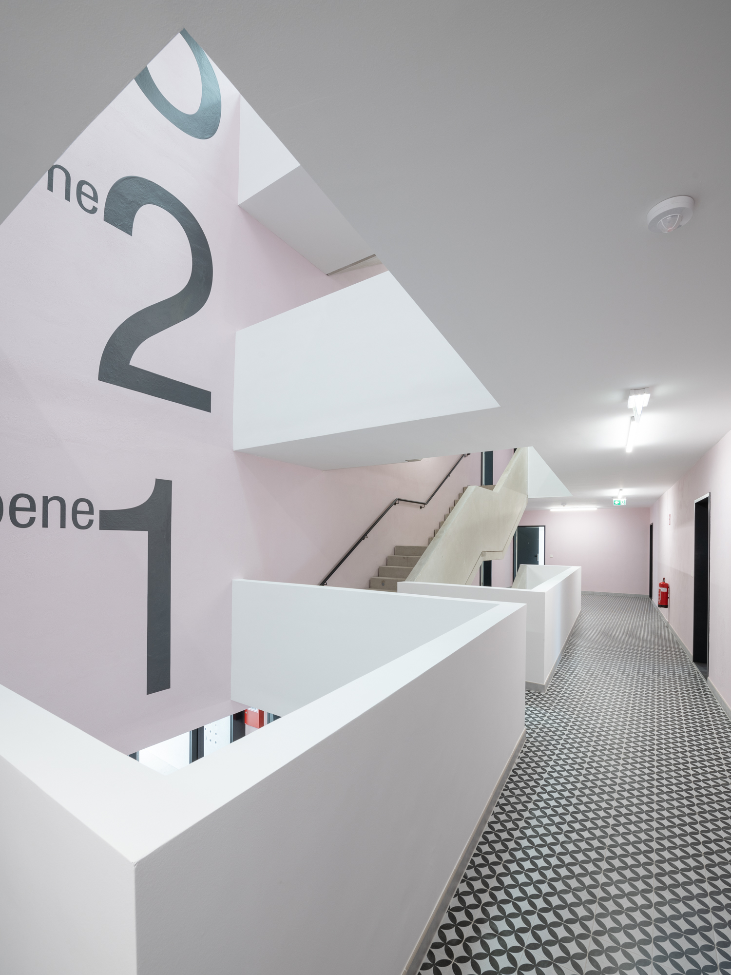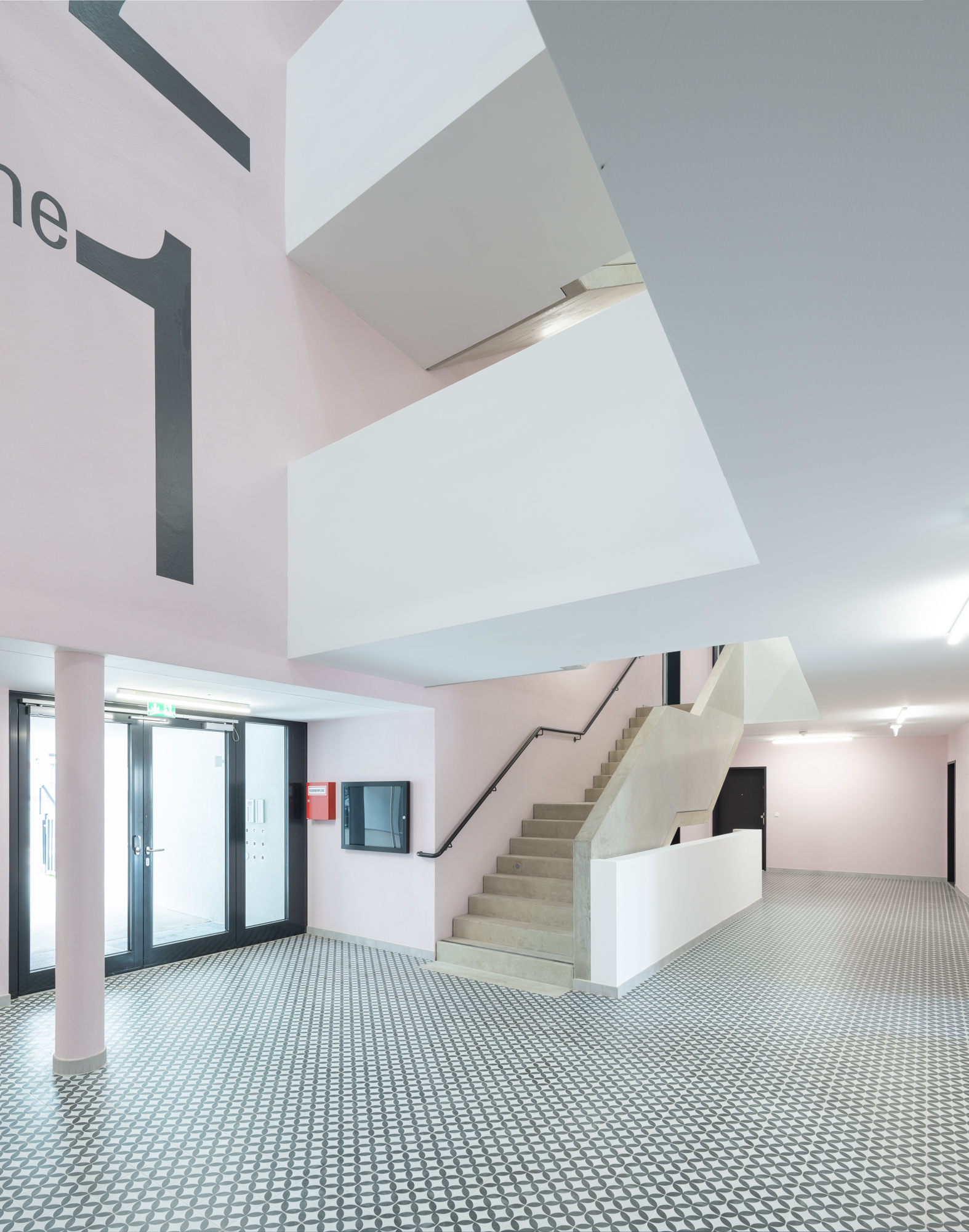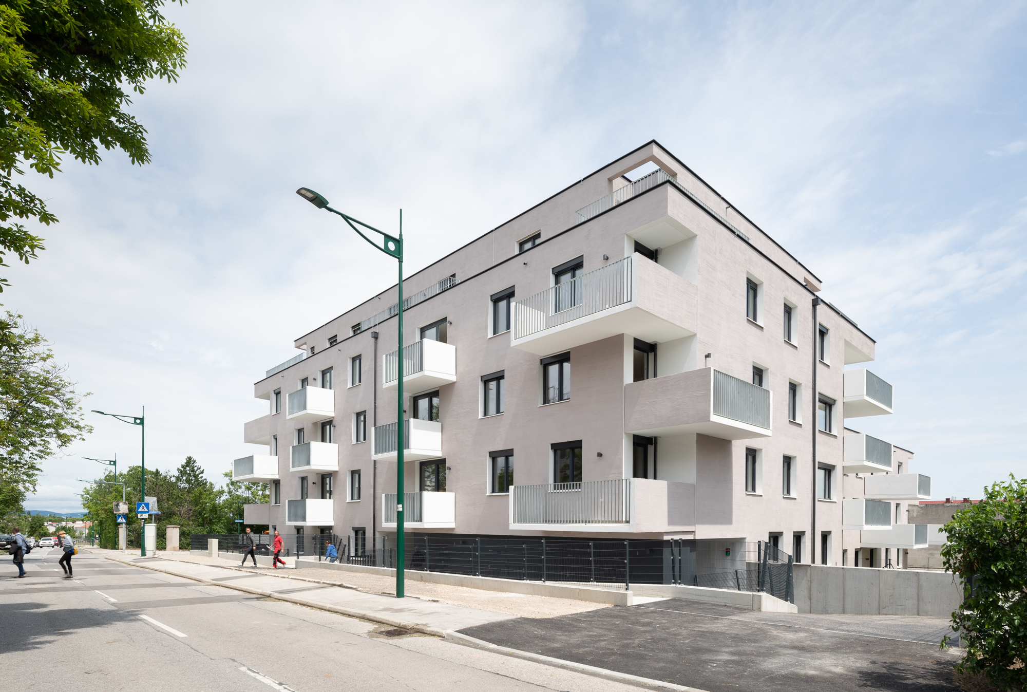 Zasnova stanovanjskega objekta vzhodno od Grutschgasse vnaprej določeno L-obliko razvije v atrijski objekt, organiziran okoli svetlega in velikodušnega notranjega dvorišča. Takšna struktura zagotavlja jasno orientacijo in pregledne poti, hkrati pa dviguje bivanjsko kakovost: dostopne in skupnostne površine so naravno osvetljene, istočasno v stavbi ni stanovanj z neugodno severno usmeritvijo. V pritličju so umeščeni skupni prostori z neposrednim izhodom na vrt; stavba se tu odpira proti veliki prosti površini, uporabni za vse od vsakdanjih srečanj do skupnostnih praznovanj. Uvoz v podzemno garažo je spretno umeščen v stavbni volumen na način, da južni rob ostane nemoten in namenjen stanovanjskim vrtovom.
